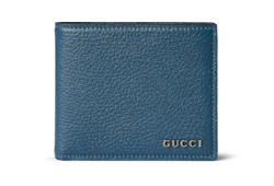 A selection of small leather accessories featuring the Gucci logo return for Pre-Fall 2025. Crafted from blue grainy leather, this bi-fold wallet features multiple card slots and bill compartments.