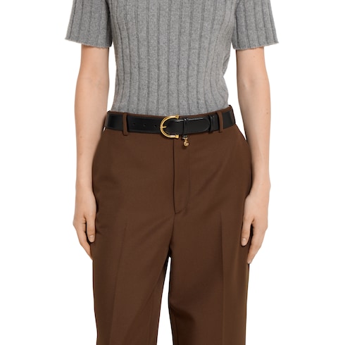 In the Fall Winter 2025 collection, this belt embodies Gucci’s heritage with a stirrup buckle with Double G charm. Crafted from black leather, the design offers an elegant yet effortless aesthetic.