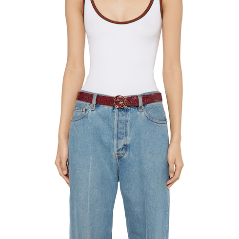 Taking inspiration from archival elements, the Interlocking G logo continues to define a selection of leather accessories. The 1970s inspired enameled logo appears on this woven leather belt.