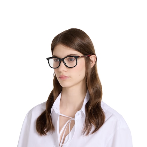 The Pre-Fall 2025 eyewear collection presents sleek silhouettes with the signature Web stripe at the temples. These rectangular optical frames are stated in black acetate with Web temples and an Interlocking G detail.