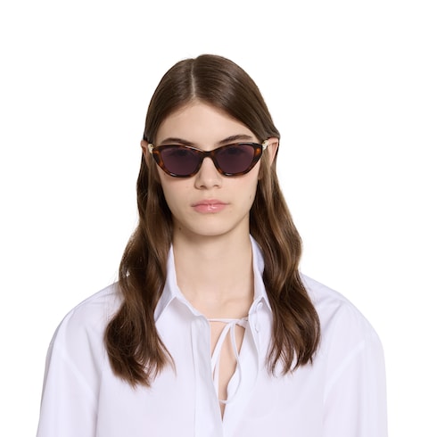 The Pre-Fall 2025 eyewear collection blends statement silhouettes from the archives with a contemporary touch. These cat eye frame sunglasses are stated in medium brown tortoiseshell and light gold-toned metal with pearls and a cut-out Interlocking G.