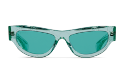 The Pre-Fall 2025 eyewear collection presents the Guccissima motif in a bold hue and silhouette. These cat eye sunglasses are stated in acetate with an allover GG motif. A solid turquoise lens completes the silhouette.