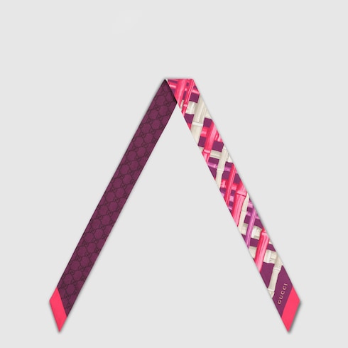 The Cruise 2026 women's silk accessories collection reimagines archival motifs with innovative prints. Presented in a silk twill, this ribbon reveals an allover GG bamboo print.