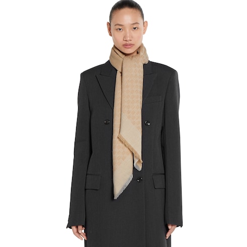 The Pre-Fall 2025 collection presents the GG motif across a wide selection of silk accessories that can be layered. Crafted from a GG denim-effect material in wool silk cotton, this soft shawl is completed with a fringe trim.