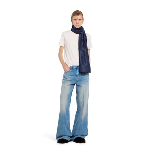 The House's silk accessories collection continues to reinterpret emblematic motifs, from the GG, Web, Flora, bamboo, Horsebit and equestrian inspirations, in sumptuous materials, intricate craftsmanship, and fresh hues. This shawl is presented in GG silk wool lamé and decorated with a fringe trim.