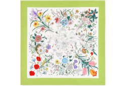 The Pre-Fall 2025 soft accessories collection animate House codes through sophisticated trimmings, logo patches and subtle embroideries. Presented in a silk twill, this carré reinterprets Gucci's Flora motif in fresh hues.