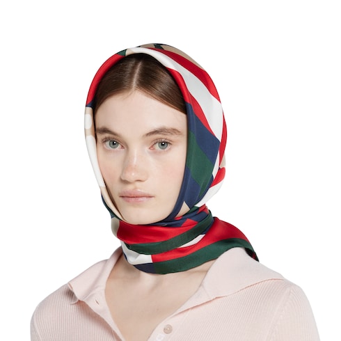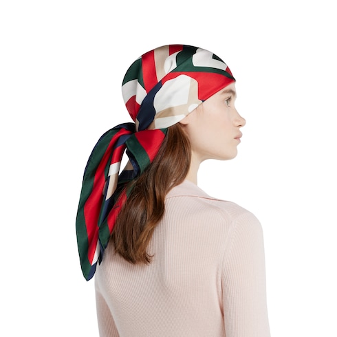 В коллекции Cruise 2025 фирменные символы и коды Дома были переосмыслены в современном прочтении. Этот платок каре выполнен из шелка коричневого и красного цветов и дополнен сплошным принтом в виде конного мотива.