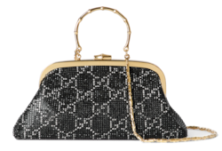 Introducing Spring Summer 2026. This evening bag is featured in the "La Primadonna" look of La Famiglia. It is crafted from an allover GG crystal mesh, and reveals a satin lining with the "Made in Italy by Gucci" label inside. The style is complete with bamboo-detailed hardware which echoes the House heritage.
