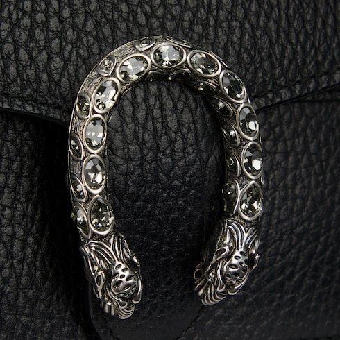 Геометричная миниатюрная сумка из кожи с плечевым ремнем-цепочкой дополнена карабином, с помощью которого аксессуар можно прикрепить к более крупной сумке. Дизайн завершает рельефная застежка в форме подковы с тигриными головами — оригинальный декор, отсылающий к мифу о древнегреческом боге Дионисе, который по преданию переплыл реку Тигр на тигре, посланном ему Зевсом. Застежка украшена кристаллами Swarovski. Модель из прочной фактурной кожи.