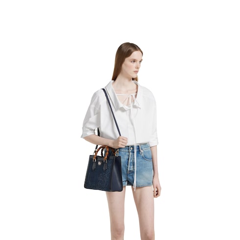 Infused with a warm-weather spirit, the Gucci Diana tote bag is crafted from blue floral embroidered denim. Defined by bamboo handles and Double G hardware, the style blends seasonal textures with the House’s signature elements.