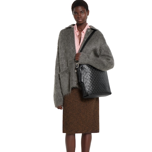 In the Fall Winter 2025 collection, the GG Emblem collection reinterprets the House’s history of elegance and craftsmanship. This bucket bag highlights functional design with an interior compartment, in matching cotton lining.