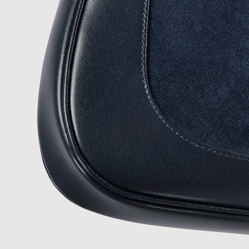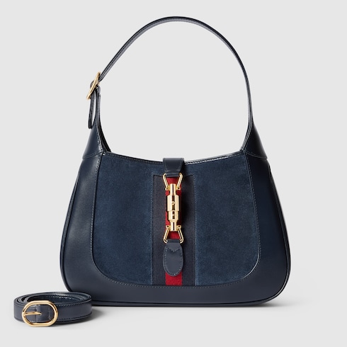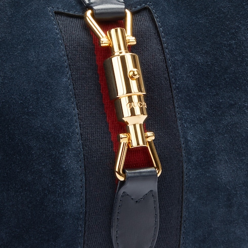 Узнаваемый аксессуар снова выходит на первый план, представая в новой современной интерпретации с дополнительным съемным плечевым ремнем. Он крепится к сумке с помощью застежки-пряжки, придает архивному дизайну современное звучание и позволяет носить сумку разными способами: за верхнюю ручку, на плече или через плечо. Модель выполнена из замши темно-синего цвета и дополнена лентой Web. Сумка Jackie 1961 доступна эксклюзивно в магазинах Gucci и на веб-сайте Gucci.com