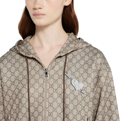 In the Pre-Fall 2025 collection, Korean artist Inji Seo‘s whimsical motifs adorn women’s ready-to-wear and small leathergoods. Crafted from beige and dark brown technical jersey, this zip jacket features a trompe l'oeil print.