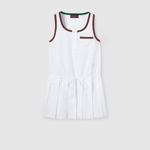 The House continues to explore its connection to the world of tennis that began in the 1970s. Signature pieces focus on heritage details like the Web stripe, as well as innovative materials. This cotton poplin dress features a green and red Web trim and pleated skirt for easy movement.