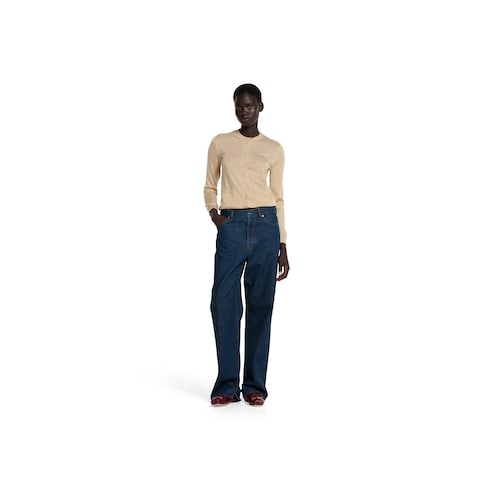 For the Pre-Fall 2025 collection, the theme of casual grandeur includes sophisticated knitwear, such as this crewneck cardigan in a fine cashmere and silk blend.