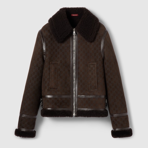 The Pre-fall 2025 collection introduces a new take on warm materials on sophisticated outerwear pieces, in traditional and contemporary silhouettes. This suede and shearling jacket presents an allover GG print. The functional and contemporary design is complete with a tonal leather trim.