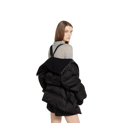 The Pre-fall 2025 collection introduces a new take on warm materials on sophisticated outerwear pieces, in traditional and contemporary silhouettes. This contemporary jacket in gabardine fine nylon features a contrasting knitted collar and cuffs and is complete with a subtle logo detail.