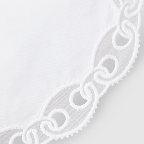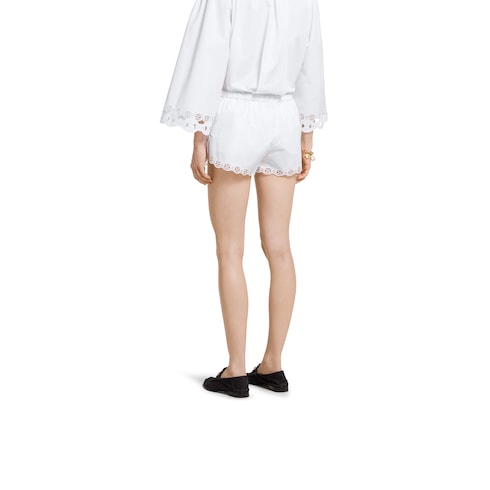 A monochrome palette with subtle details, such as embroideries or logo hardware, transitions the wardrobe from day to night in a selection of pieces from the Pre-Fall 2025 collection. This pair of cotton poplin shorts are defined by a cut-out Marina Chain embroidered hem.
