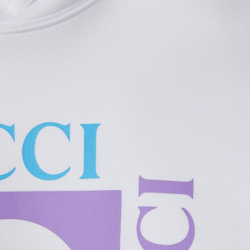 For the Pre-fall 2025 collection, everyday pieces are elevated with prints or embroideries for a casual feel. This cotton double jersey sweatshirt features a fixed hood and a Gucci vintage logo print on the front.