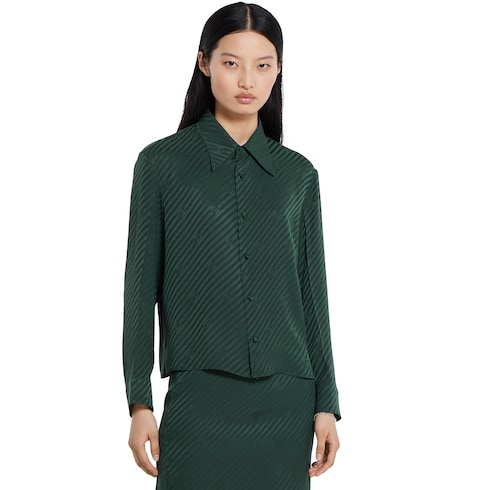 In the Fall Winter 2025 collection, this shirt is crafted from dark green diagonal Interlocking GG silk jacquard. Designed with a pointed collar and a covered button closure, the style is finished with buttoned cuffs.