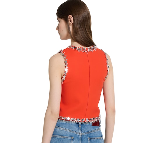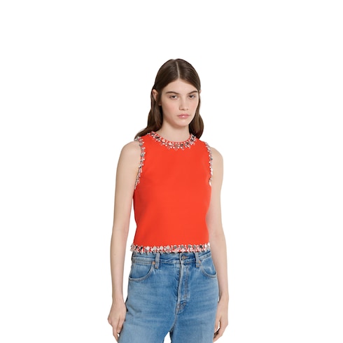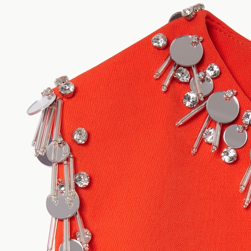 For the Pre-fall 2025 collection, colorful tops and dresses infuse ready-to-wear with a vibrant twist for the transitional wardrobe. This cady crêpe wool silk top in bright orange has a modern silhouette with a crystal embroidered trim.