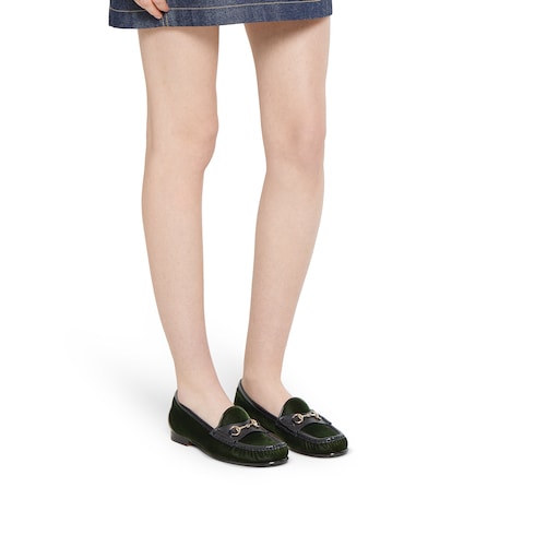 One of the House's most signature styles, the Gucci loafer is presented here crafted in velvet. The rounded shape mixes with a gold-toned Horsebit piece as a tribute to Gucci's heritage.