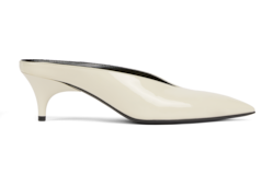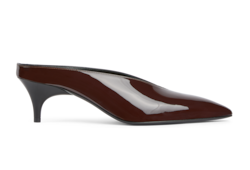 In the Fall Winter 2025 collection, a bold expression of femininity, this women's heeled mule is presented in glossy patent leather with a sharp pointed toe. The sleek silhouette channels a sense of contemporary sophistication, blending retro undertones with modern elegance.