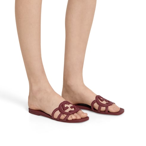 Узнаваемые символы Дома и изысканные узоры переосмыслены в современных вариациях для новой коллекции Gucci. Эти шлепанцы выполнены из красного каучука Gucci Rosso Ancora с вырезанной деталью в форме переплетенных букв G.