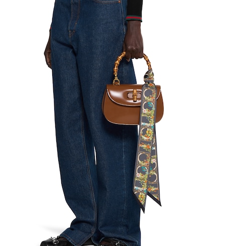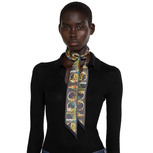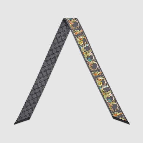 The Pre-Fall 2025 silk accessories' collection animate House codes through sophisticated trimmings, logo patches and subtle embroideries. This versatile ribbon has been crafted from a silk twill and defined by an allover floral GG Gucci print.