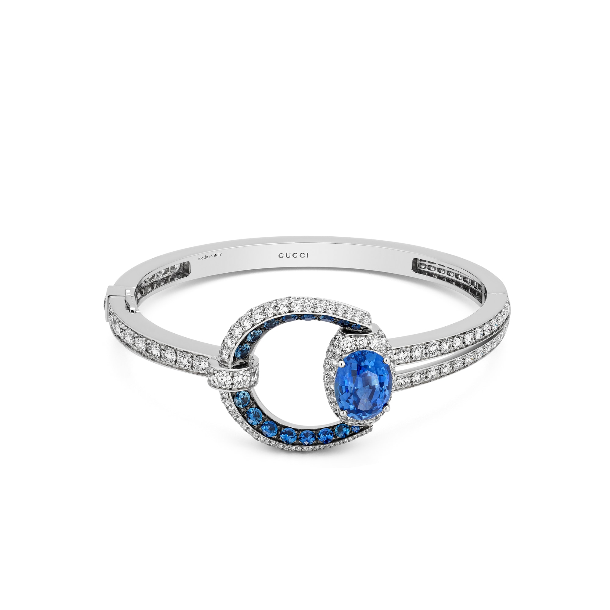 このブレスレットには、5.19カラットの大ぶりなオーバルカットのサファイアと、さまざまなサイズのサファイアをあしらっています。ブルーメタルのコーティングが、色彩のコントラストとモダンなフォルムの魅力を際立たせています。