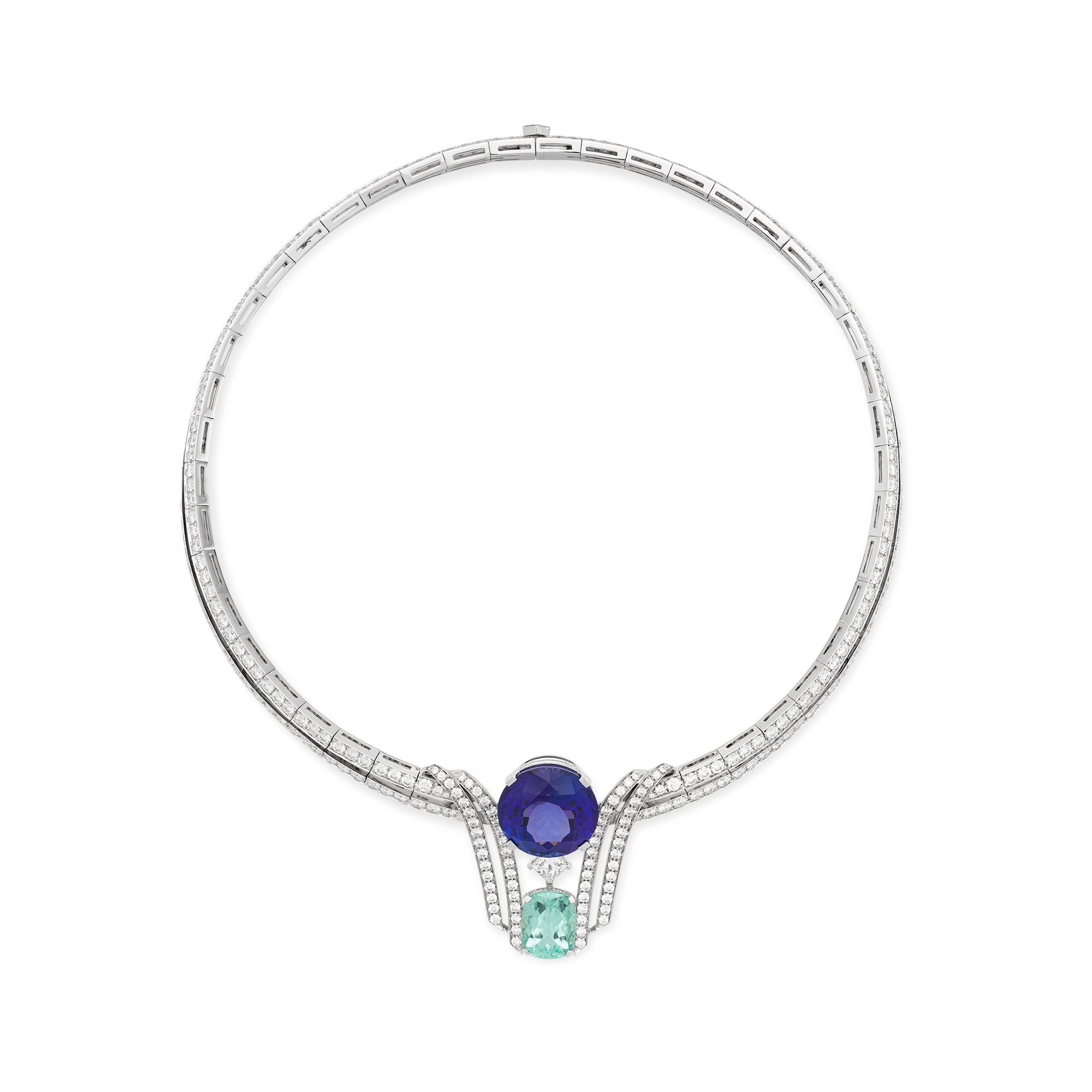 ネックラインを包み込むようなこのネックレスには、24.75カラットのラウンドカットのタンザナイトと、5.94カラットのクッションカットのパライバトルマリンを飾り、庭園の奥にひっそりと存在する泉を思わせる、流れ落ちるようなダイヤモンドで囲んでいます。