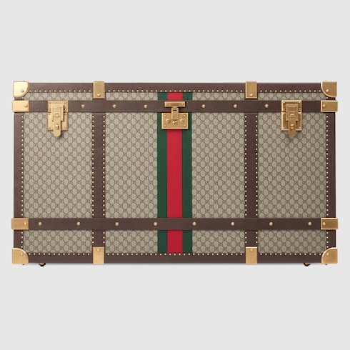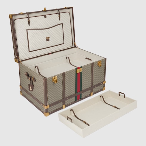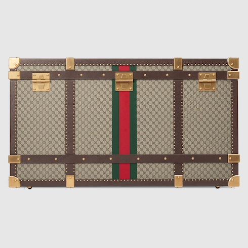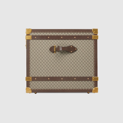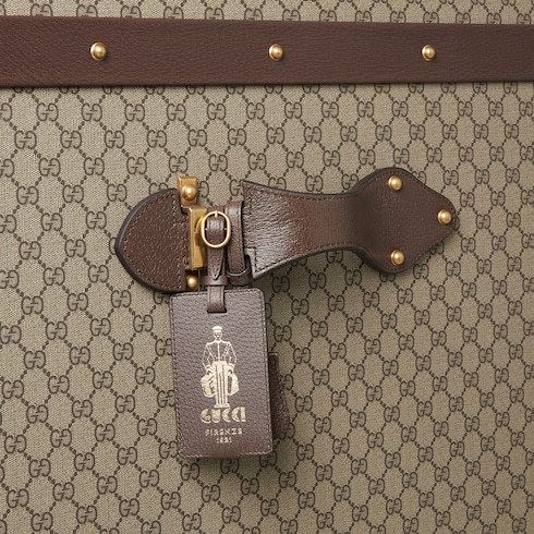 トラベル アイテムを展開する〔グッチ サヴォイ〕は、ロンドンのホテルからそのキャリアをスタートさせたブランド創設者グッチオ・グッチに捧げるオマージュ。2つのアーカイブモチーフを組み合わせて、タイムレスで色褪せないアイテムやデザインをたたえています。このハードサイド トランクは、ベージュ&エボニーのGGスプリーム キャンバスで仕立て、グリーン/レッド/グリーン ウェブ ストライプをあしらうことで、乗馬の世界にルーツを持つグッチの歴史をさりげなく表現しています。
