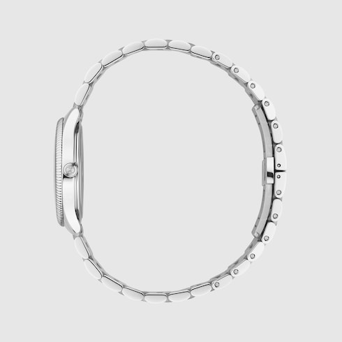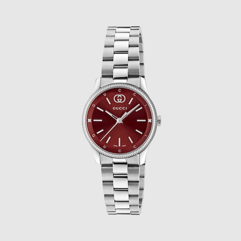하우스의 시그니처 모티브를 강조하며 신선한 컬러 팔레트로 변화를 탐색한 최신 컬렉션의 G-타임리스 라인. 쿼츠 무브먼트로 구동되며 스테인리스 스틸 스트랩과 버건디 다이얼로 완성한 시계.