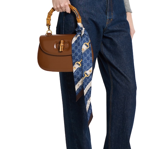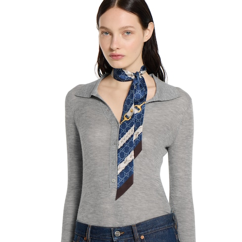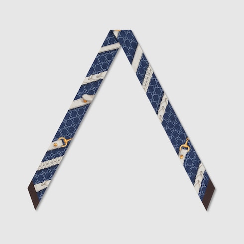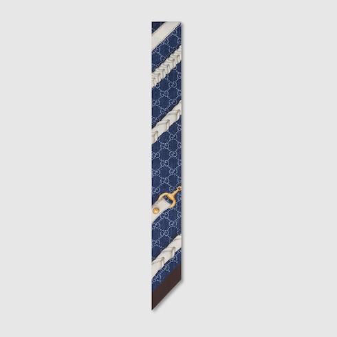 하우스와 승마 세계의 연결 고리를 예찬하는 우아한 톤의 홀스빗 디테일과 라이딩 모티브. 실크 트윌을 바탕으로 GG 프린트와 홀스빗 벨트 프린트를 전체적으로 펼쳐낸 리본.