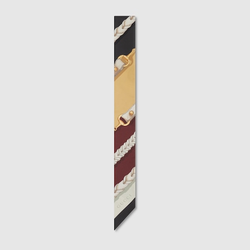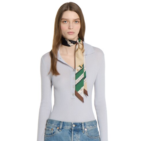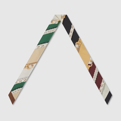 하우스와 승마 세계의 연결 고리를 예찬하는 우아한 톤의 홀스빗 디테일과 라이딩 모티브. 실크 트윌을 바탕으로 홀스빗 체인 및 벨트 프린트를 전체적으로 펼쳐낸 리본.