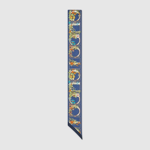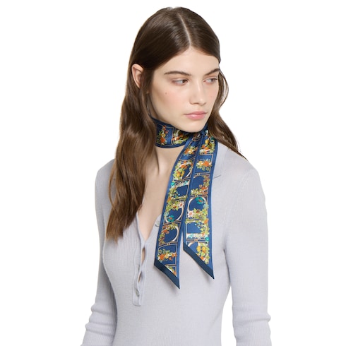 Nella collezione Pre-Fall 2025, gli accessori in seta aggiungono un tocco di vivacità ai codici della Maison attraverso finiture raffinate, patch con logo e ricami delicati. Questo versatile nastro in twill di seta è definito da una splendida stampa floreale Gucci GG all over.