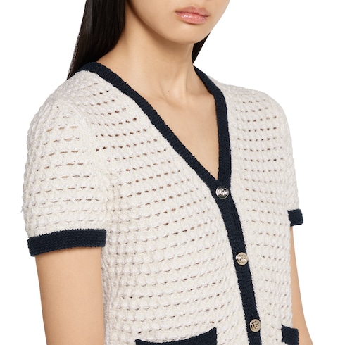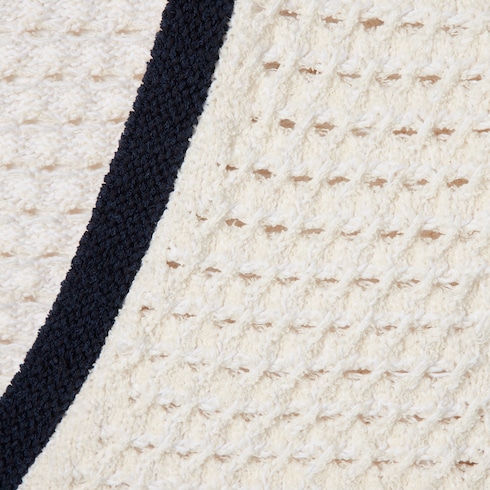 Maritime Designs, inspiriert vom Meer, verleihen der Pre-Fall 2025 Kollektion mit Streifen, unverwechselbaren Motiven und kontrastierenden Besätzen eine frische Note. Dieses Oberteil aus feiner, gehäkelter Baumwolle erhält durch einen kontrastierenden Besatz in Marineblau einen eleganten Akzent, während die goldfarbenen Doppel G Knöpfe das Licht der neuen Jahreszeit einfangen.