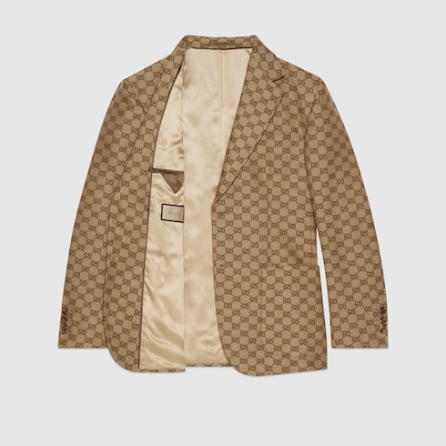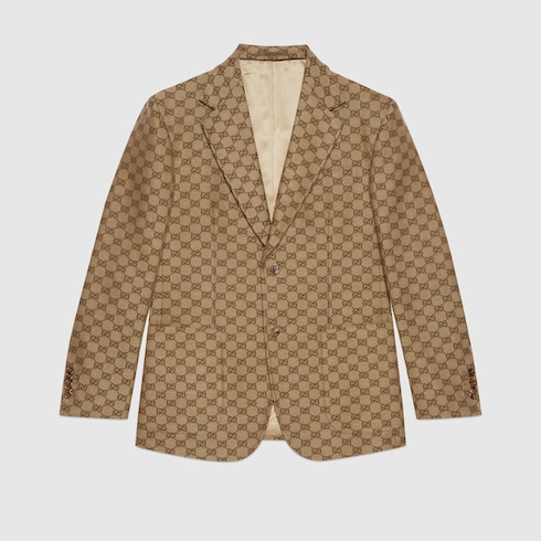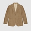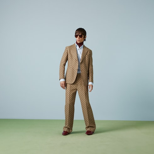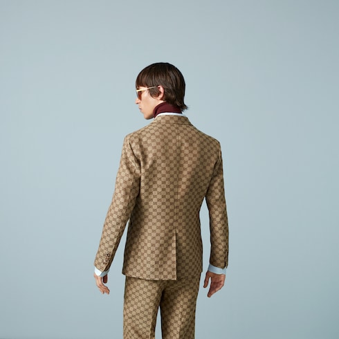 El logotipo sigue siendo una característica distintiva de las colecciones de Gucci y aparece sobre este chaqueta formal camel y ébano. Un homenaje al fundador Guccio Gucci creado originalmente en los años 30, el distintivo diseño de la GG ha sido la inspiración para nuevas exploraciones de expresión durante casi un siglo.