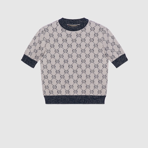 Una fuerte sensación del logotipo se entreteje en toda la colección en una exploración de la posibilidad dentro de la versatilidad. Una variedad de piezas ready-to-wear de la colección Gucci Love Parade encarnan esta temática a través de un diseño esencial de Gucci reelaborado de maneras contemporáneas. Este top cuenta con un diseño de jacquard con GG en tela metalizada.