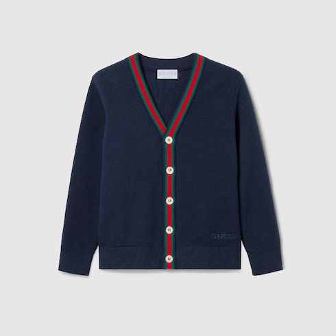 Das Web aus den Archiven rückt in der Cruise 2025 Kinderkollektion in verschiedenen Variationen in den Fokus. In Grün und Rot sorgt es als Besatz auf Ready-To-Wear-Modellen, Schuhen und Accessoires für sportliche Looks mit vielseitigem Charakter. Dieser Kinder-Cardigan mit V-Ausschnitt ist aus marineblauer, gestrickter Baumwolle mit Wabenmuster gefertigt und wird von einem grünen und roten Web-Detail sowie einer Gucci Stickerei akzentuiert.