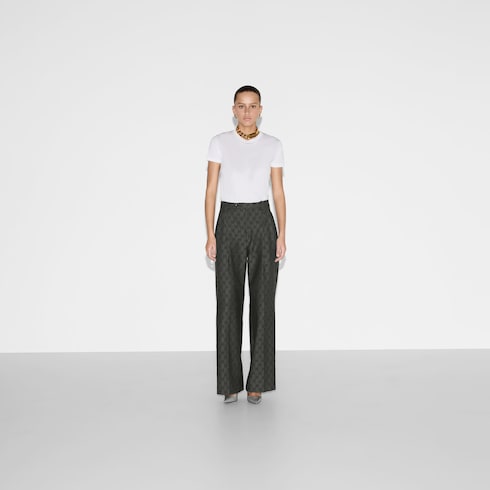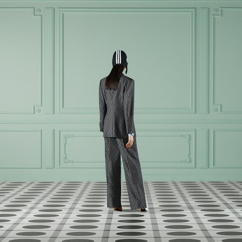 El logo GG, usado por primera vez en los años 70, fue una evolución del diseño de rombos Gucci original de los años 30. Desde entonces, ha sido un símbolo destacado de la tradición de Gucci. Este pantalón forma parte de la colección Exquisite Gucci y está confeccionado en lana con GG gris y negra.