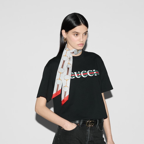 The House's heritage motifs shine through eye-catching new prints. Here, this GG silk jacquard ribbon features a Gucci Horsebit print across the top, demonstrating Gucci's design inspirations from the equestrian world.