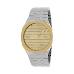 La silhouette épurée de la GUCCI 25H s’inspire des formes élancées de l’architecture contemporaine. La montre est présentée avec un boîtier à plusieurs couches plaqué or et un bracelet en acier à cinq maillons.