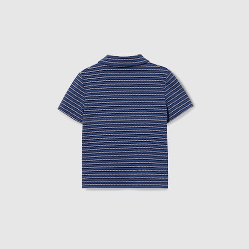 La colección infantil Pre-Fall 2025 exhibe una amplia gama de motivos populares, entre los que destacan los distintivos detalles de logotipo. Este polo para bebé se ha confeccionado en punto de algodón a rayas con un detalle de intarsia Gucci.
