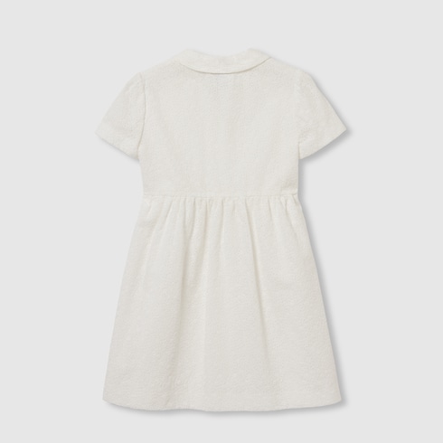Desde bordados sutiles hasta estampados integrales, los motivos exclusivos siguen realzando la selección infantil Gucci Cruise 2025. Este vestido infantil se ha confeccionado en broderie anglaise floral blanco roto con unos botones de flor con Doble G.
