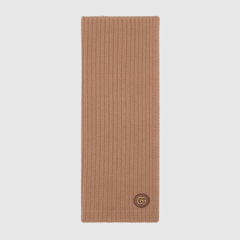 Dieser Schal ist in camelfarbenem Rippstrick aus Wolle und Kaschmir gehalten. Das Doppel G Motiv – das einer Gürtelschnalle aus den 70ern nachempfunden ist – ziert das Design in Form eines Lederpatches.