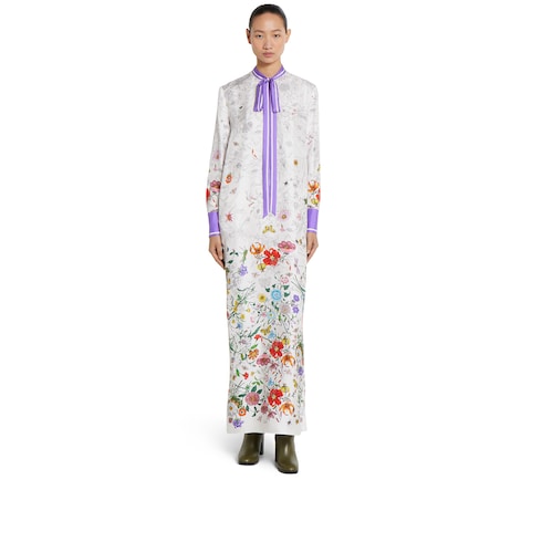 Der Flora-Print aus den Archiven der 1960er wird auf den Ready-To-Wear-Modellen zu neuem Leben erweckt und für Pre-Fall 2025 in frischen Farben und Farbverlaufdesigns mit romantischer Note präsentiert. Hier ziert er ein langes Kleid aus Baumwolle mit Halsschleife zum Binden.