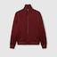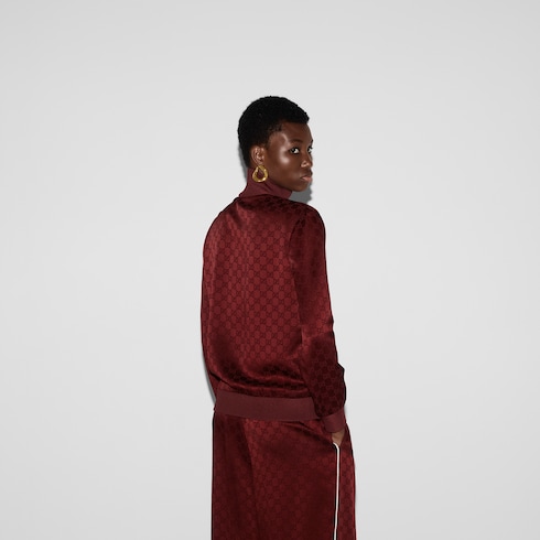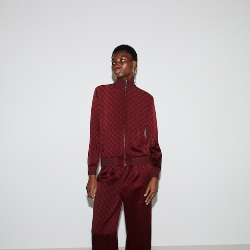 Le selezioni Pre-Fall presentano silhouette essenziali con dettagli emblematici, offrendo un'interpretazione moderna dei celebri codici e simboli della Maison. Questa giacca con cerniera è proposta nell'esclusivo Gucci Rosso Ancora con motivo GG e tessuto effetto matte.
