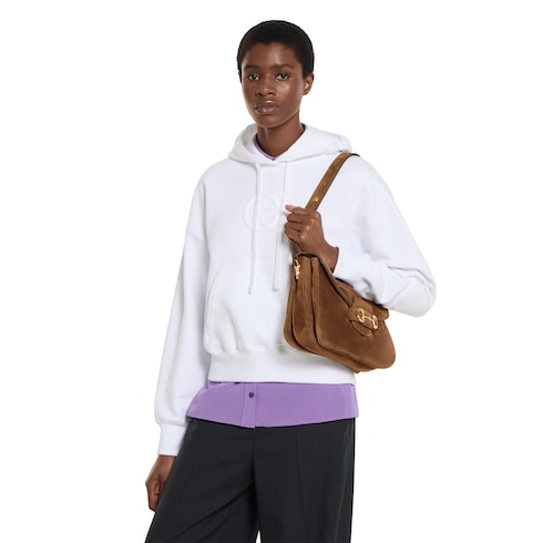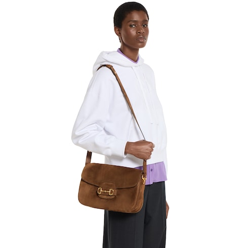 2025秋冬系列, 这款肩背包再现品牌马术风格设计,融蕴浅金色调细节与柔软光面皮革,搭配双环和长条配件,为Gucci Horsebit 1955系列添砖加瓦。
