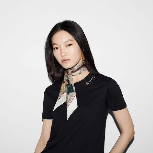 Paying homage to Guccio Gucci’s beginnings as a porter at the Savoy hotel in London, this ribbon combines GG Gucci valigeria print with the House's emblematic palette.